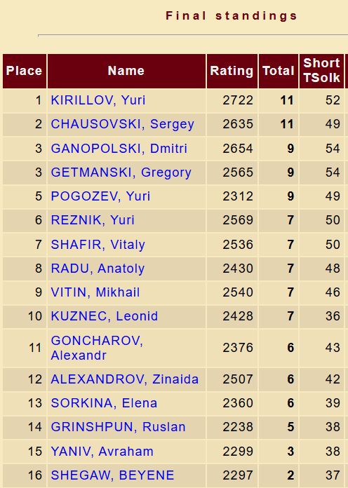 По положению обоим присвоено звание чемпиона. Если к успехам всезнающего Юрия Кириллова в израильских турнирах мы привыкли, то успех Сергея Чаусовского хочется отметить особо — Сергей очень ровно провел турнир и в последнем туре победил Григория Гетманского, одного из фаворитов турнира.