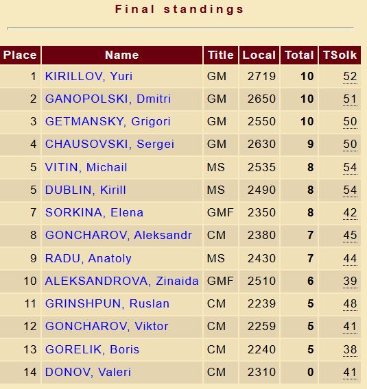 В итоге, победив в последнем туре, с результатом 10 очков из 14 возможных 1-е место разделили более опытные гроссмейстеры Юрий Кириллов из Кирьят-Хаима и Дмитрий Ганопольский из Нетании. По положению оба участника были объявлены чемпионами Израиля. Столько же очков набрал наш гость Григорий Гетманский, который играл вне конкурса.