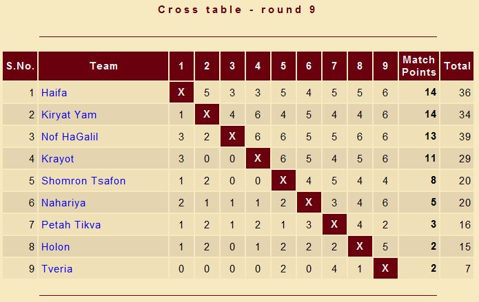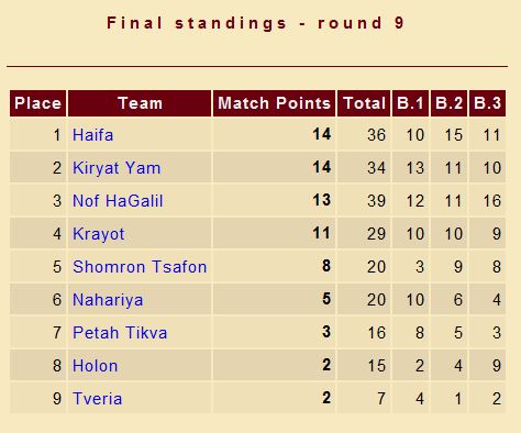 На втором месте — Кирьят-Ям, который навязал борьбу своему «большому соседу». Кирьят-Ям также набрал 14 матчевых очков, но меньшая сумма очков по доскам (34) решила исход противостояния.