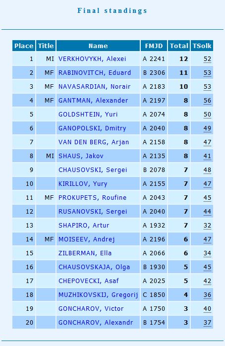 Победителем турнира стал международный мастер Алексей Верховых (Нетания), набравший 12 очков.